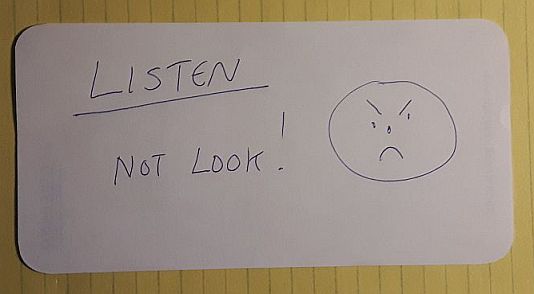 When they rewatched the video and listened carefully, they heard the message "That ... which ... you ... seek ... lies ... beneath ... the ... words ... which ... led ... you ... to ... me"Where the ...'s represent long pauses, inserted to make the message more difficult to discern. The meaning of the clue was that the real treasure was in a different envelope, under the cover on the dining room table. They had been using the dining room table to collect the letters and solve the anagram. When they rewatched the video and listened carefully, they heard the message, and found the real treasure ($20 for each particpant). |