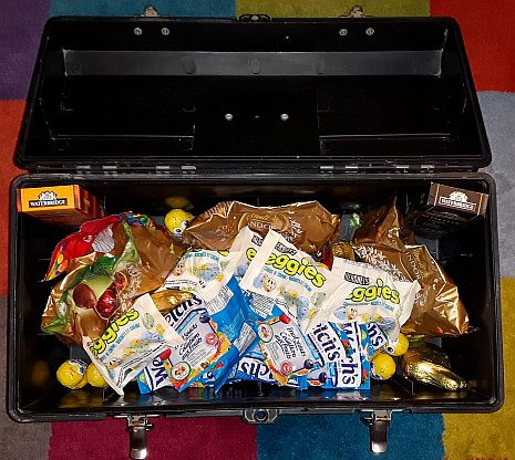 There were exactly one hundred eggs, and each egg contained only one item: a piece of a jigsaw puzzle. On the back of each jigsaw piece was written one letter. When all the eggs were located and the jigsaw completed, The participants flipped over the puzzle. The words on the back of the puzzle where the names of songs from the album Americana from the rock group The Offspring. Unfortunately, no one was familiar with the album, but as the list of words looked somewhat like the names of songs, they guessed that the next clue lay somewhere in a CD. So they searched through all the CDs looking for anything which might help. When they reached Americana, they found a key inside. The key unlocked a tool chest, which happened to be sitting conveniently nearby, and was filled with chocolates and candies and other treats. |