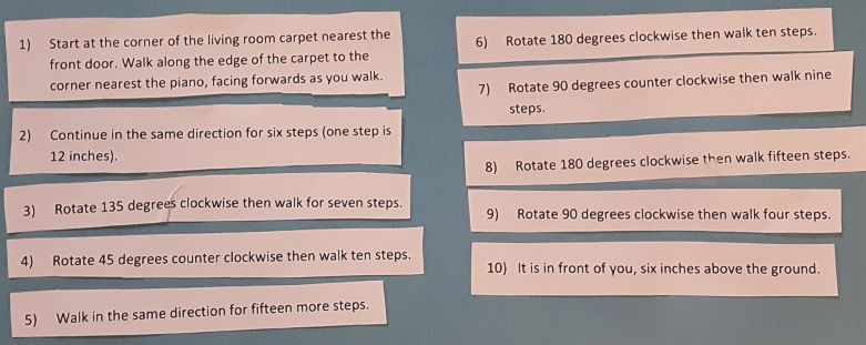 Once the letters were put in the proper order, six messages were revealed. The first five messages referred to locations in the kitchen where additional items were hidden. The last message was simply a distraction. 1. UNDER TINY WAVES (under the microwave oven). 2. UNDER THAT WHICH IS LAID (under the eggs in the refrigerator). 3. BEHIND SMOKE ALARM SOUNDS (behind a poster which explains all the sounds the smoke alarm can make). 4. UNDER YELLOW FLOWERS (under a vase of yellow flowers on the kitchen table). 5. WITH PURPLE MITTENS (inside the purple oven mitts). 6. A FAKE CLUE At each location were two slips of paper. Once all ten slips were found, they gave directional instructions: |
